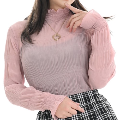 超伸縮!! 清楚系ハイネックシフォンブラウス 長袖 ピンク
